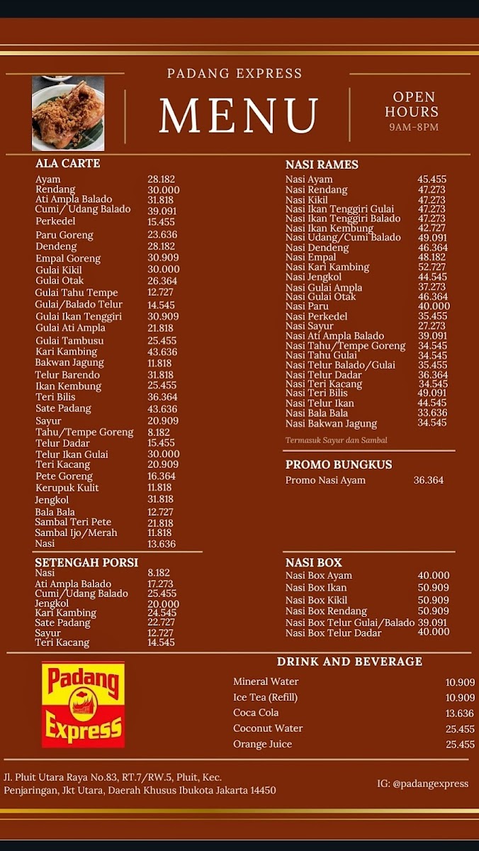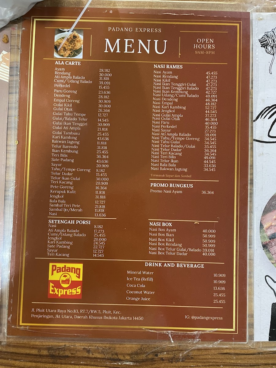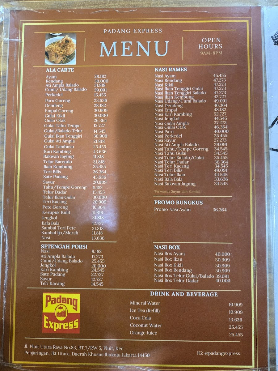 Padang Express offers an authentic taste of Padang cuisine right in North Jakarta, renowned especially for its crispy fried chicken. This dish, freshly cooked to order, is a star attraction—its crunch outside contrasts beautifully with the juicy, tender meat inside. Other highlights include the rendang, rich in spices, and the unique vegetable curry, which stands out for its distinct flavor profile. The deep-fried “paru” (beef lung) is served thin and crispy, adding a delightful texture not commonly found in typical Padang menus. Portions are generous, particularly the rice servings, ensuring satisfying meals. The restaurant maintains traditional touches, such as banana leaf packaging for takeaways, emphasizing authenticity. Service is prompt and friendly, though drinks may take slightly longer. Conveniently located near Stella Maris Church in Pluit, Padang Express delivers a memorable culinary experience for lovers of hearty Indonesian flavors in a clean, welcoming environment. It’s a must-visit for Padang food enthusiasts seeking quality and flavor.